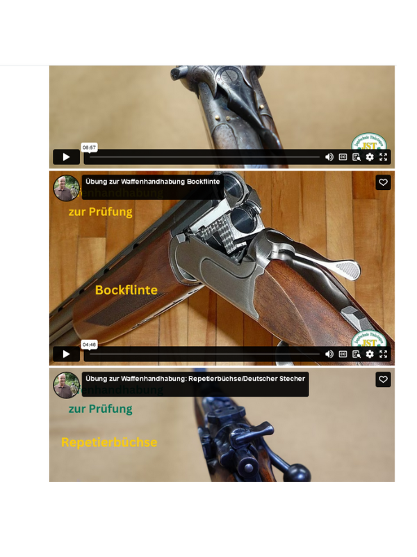 Sie erhalten einen 12 monatigen Zugang zu allen Vorlesungsmitschnitten in der JST. Weiterhin Videos zur Waffenhandhabung in der mündl.-prakt. Prüfung, Präparatefotos mit Legende, Videos zur Waldbegehung, Aufbrechen, Zerwirken, Schießausbildung in allen Prüfungsdisziplinen, ausdruckbare Vorlagen zum Waffenrecht, Jagdrecht, Abschußplanung uvm. Im Prinzip die gesamte theorethische Ausbildung zum selber stöbern, wiederholen oder zur Prüfungsvorbereitung.