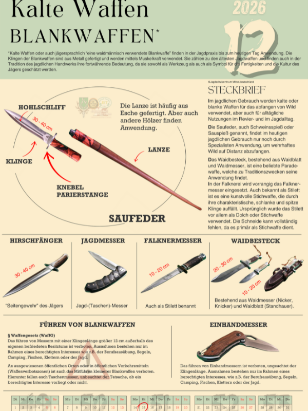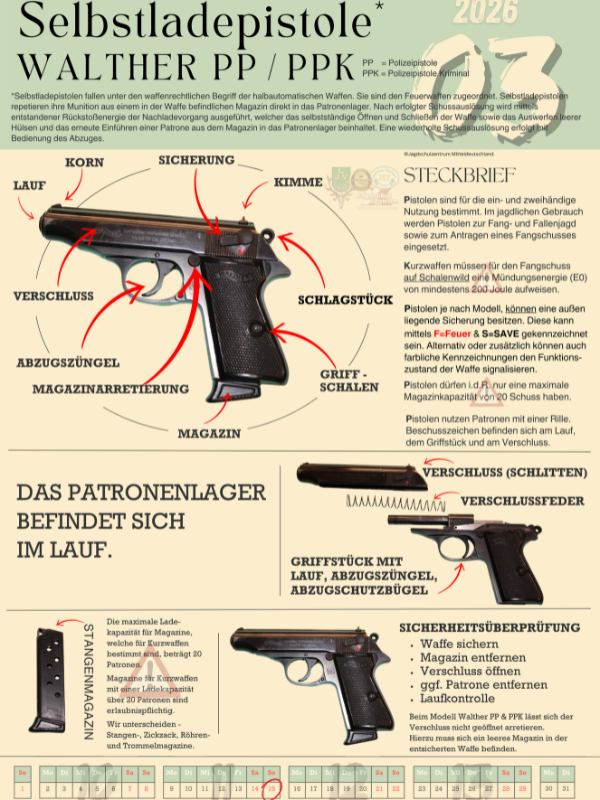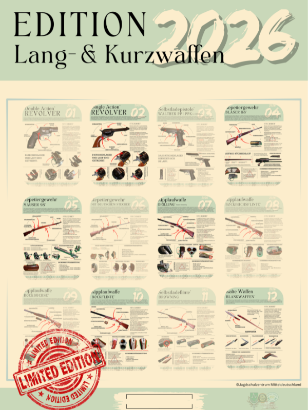 Entdecke die Sammleredition des Jahreskalenders 2026 für Lang- und Kurzwaffen! Auf 12 hochwertigen Kalenderblättern präsentieren wir dir jeweils eine für die Jägerprüfung relevante Waffe. Jede Seite ist mit detaillierten Explosionszeichnungen und genauer Beschreibung der Bauteile versehen.