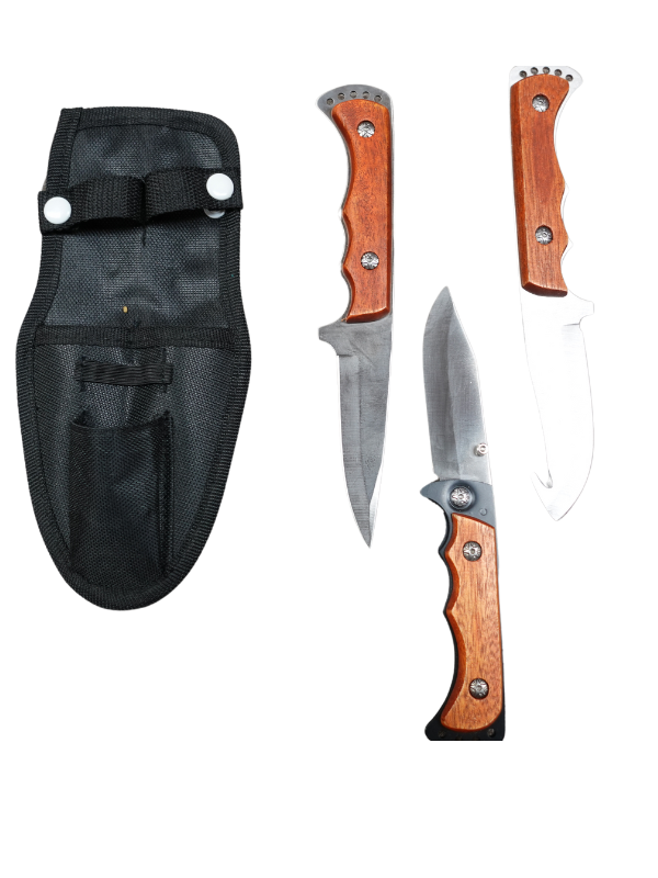 Messerset enthält: Nicker, Messer mit Aufbrechhaken und Jagdtaschenmesser (klappbar, Einhandpin kann demontiert werden). Klappmessermit fest verriegelter Klinge. Alle Messer haben die Möglichkeit zur Anbringung von Fangriemen. Auslieferung erfolgt mit gebrauchsfertiger Endschärfe.